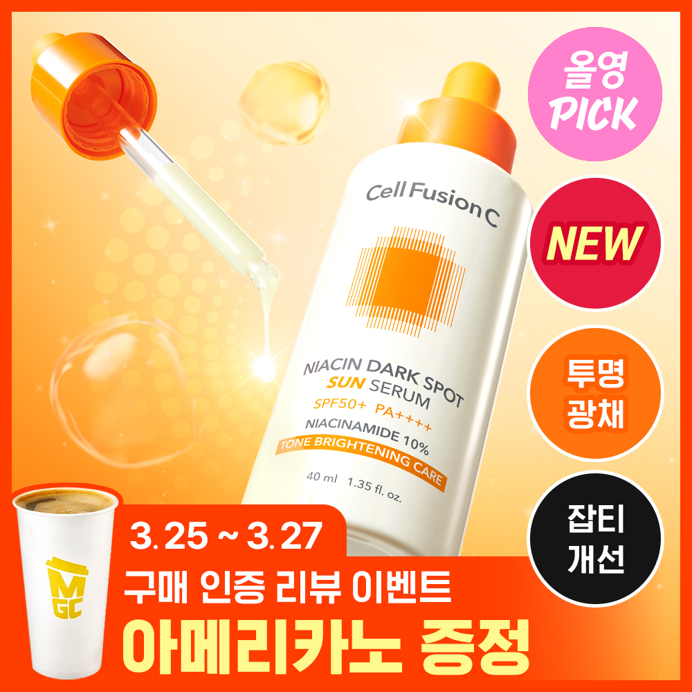 16NEW | ![[3월 올영픽/NEW/투명광채] 셀퓨전씨 나이아신 잡티 썬 세럼 40ml](https://image.oliveyoung.co.kr/cfimages/cf-goods/uploads/images/thumbnails/10/0000/0024/A00000024786210ko.jpg) | [3월 올영픽/NEW/투명광채] 셀퓨전씨 나이아신 잡티 썬 세럼 40ml | 셀퓨전씨 | | ⭐ 4.9 | |