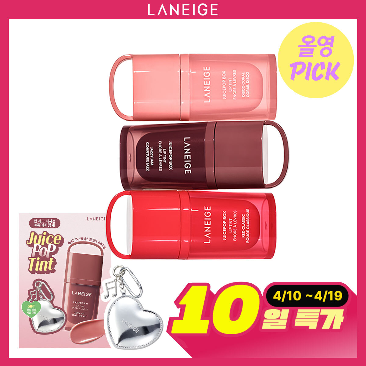 24▼ 18 | ![[4월 올영픽/하트키링 증정] 라네즈 주스팝박스 립틴트 4.5g](https://image.oliveyoung.co.kr/cfimages/cf-goods/uploads/images/thumbnails/10/0000/0024/A00000024898011ko.jpg) | [4월 올영픽/하트키링 증정] 라네즈 주스팝박스 립틴트 4.5g | 라네즈 | | ⭐ 4.7 | |