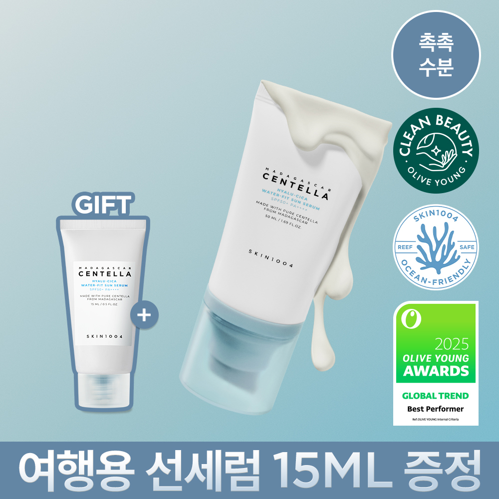 41▼ 14 | ![[수분 선크림][누적판매1400만개]스킨1004 마다가스카르 센텔라 히알루-시카 워터핏 선세럼 50ml](https://image.oliveyoung.co.kr/cfimages/cf-goods/uploads/images/thumbnails/10/0000/0016/A00000016949934ko.jpg) | [수분 선크림][누적판매1400만개]스킨1004 마다가스카르 센텔라 히알루-시카 워터핏 선세럼 50ml | 스킨1004 | | ⭐ 4.9 | |