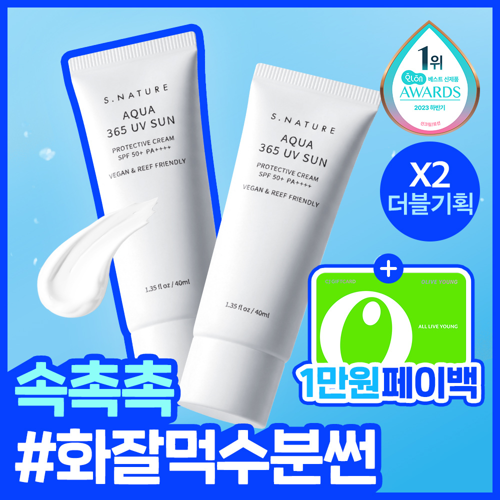 20▲ 2 | ![[페이백이벤트/1등 화잘먹 속촉촉수분썬] 에스네이처 아쿠아 365 UV 선크림 40ml 2입](https://image.oliveyoung.co.kr/cfimages/cf-goods/uploads/images/thumbnails/10/0000/0020/A00000020818262ko.jpg) | [페이백이벤트/1등 화잘먹 속촉촉수분썬] 에스네이처 아쿠아 365 UV 선크림 40ml 2입 | 에스네이처 | | ⭐ 4.8 | |