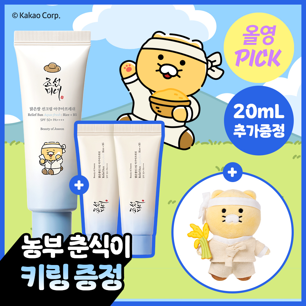 3▲ 2 | ![[올영픽/농부춘식이키링] 조선미녀 맑은쌀 선크림 50ml+20ml 증정 기획](https://image.oliveyoung.co.kr/cfimages/cf-goods/uploads/images/thumbnails/10/0000/0022/A00000022465712ko.jpg) | [올영픽/농부춘식이키링] 조선미녀 맑은쌀 선크림 50ml+20ml 증정 기획 | 조선미녀 | | ⭐ 4.8 | |