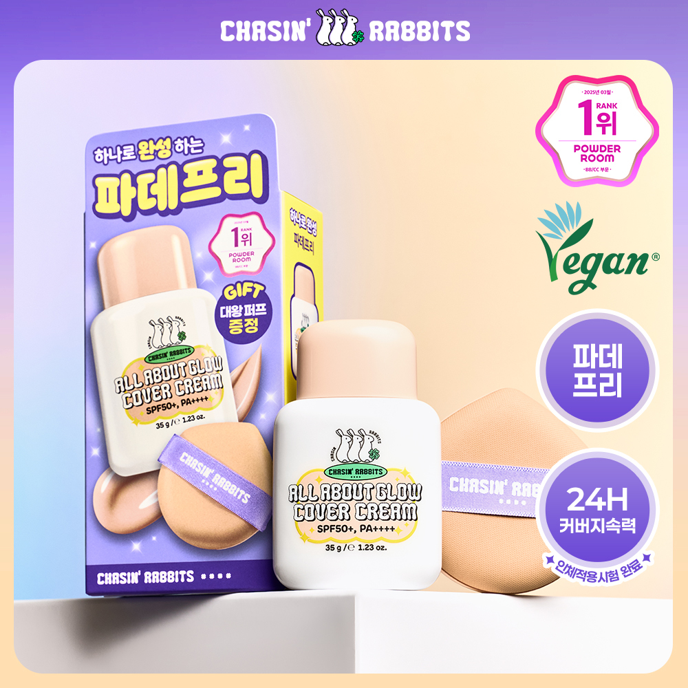 23▲ 29 | ![[파데프리/톤업선크림]체이싱래빗 올어바웃글로우 커버크림 35g기획(대왕퍼프)](https://image.oliveyoung.co.kr/cfimages/cf-goods/uploads/images/thumbnails/10/0000/0023/A00000023205316ko.jpg) | [파데프리/톤업선크림]체이싱래빗 올어바웃글로우 커버크림 35g기획(대왕퍼프) | 체이싱래빗 | | ⭐ 4.7 | |